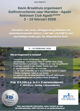 Beleef een onvergetelijke golfreis naar het zonnige Agadir in Marokko. Verblijf in het luxe Robinson Club Hotel, direct aan zee en omringd door schitterende natuur. Tijdens deze reis speel je op vijf unieke golfbanen, waaronder Taghazout, Les Dunes, Golf de l’Océan en Golf du Soleil – stuk voor stuk uitdagend en prachtig gelegen.