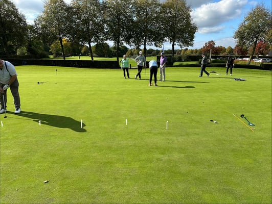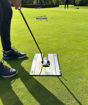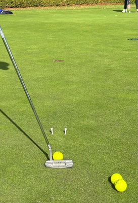 Met putten zijn we aan de slag gegaan met de set-up met behulp van het spiegeltje. Hierin kon je jouw ogenlijn checken en daarmee ook de afstand tot de bal. Belangrijk om de voeten hierbij parallel neer te zetten.