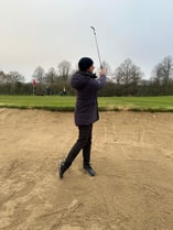 In de bunker zijn we bezig gegaan met de vertaling van het pitchen naar een bunker slag. De eerste informatie was dat het 'low-point' (zie pitch) nu de plek van de bal is. Met andere woorden, de bal ligt op 1/4 afstand van de voorste voet.