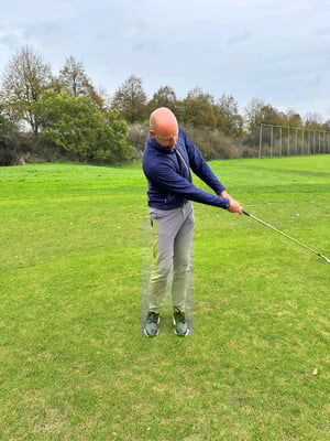 Wat opviel is dat we bijna allemaal vergeten om de club na het raken van het zand te laten versnellen. Dit doen wij door het lichaam actief door te draaien en soms zelfs helemaal tot in een eindstand zoals op de foto. Kijk vooral naar hoeveel gewicht er op het voorste been staat.