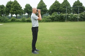 Een andere oefening om de vertreklijn van de bal te trainen is met de tees als poortje. Een uitdagende oefening waarbij je vooral het hoofd echt stil moet houden gedurende de beweging.